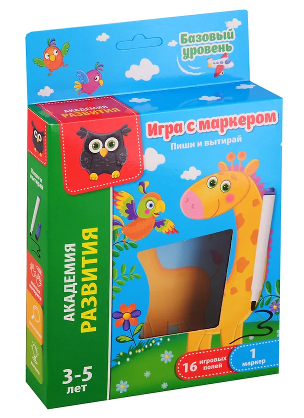 Игра с маркером «Пиши и вытирай» тебе точно понравится! Умный жираф уже подготовил специально для тебя множество заданий. Сделал ошибку? Не беда! Вытри и выполни задание снова. Выбирай понравившуюся карточку и выполняйте задание! Наведите контуры рисунка и вызволи маленькую овечку. Присмотрись внимательнее и скажи слоникам, где чье ведёрко. Помоги зайчику найти все слова. Выполнять задание можно не один раз, возвращаясь к игре снова. Играя с карточками и маркером, малыш сможет провести время весело, а также выполнить упражнения на логику, внимательность, память и потренировать мелкую мышечную моторику.