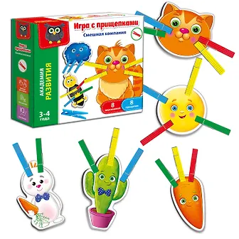 Набор содержит персонажей и прищепки. Малыш должен определить, каких деталей не хватает каждому из персонажей, и дополнить их с помощью прищепок. Например, у фигурки с солнышком нет лучиков. Берем прищепки и крепим их к нашему солнцу. Изучаем фигуры дальше. Перед нами котик, но у него нет усиков. Цепляем на щечки прищепки, и готово!