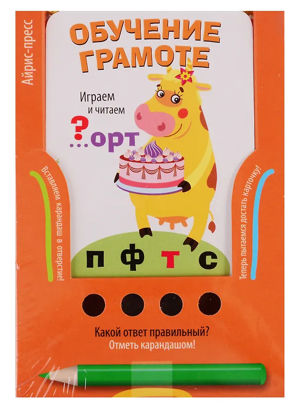 Карточки с увлекательными заданиями помогут ребёнку освоить азы чтения. Играя, он научится складывать слоги, составлять из них простые слова, читать и писать первые многосложные слова. + 2 разных игры и 96 заданий. + 48 двухсторонних карточек. + Удобная система самопроверки. Первая игра с карточками построена по типу теста. Нужно выбрать подходящий вариант ответа и вставить карандаш в отверстие под ним. Если ответ правильный, то карточка легко вынимается из блока. Если ребёнок выбрал неверный вариант ответа, он не сможет вытянуть карточку и перейти к следующему заданию. Во второй игре ребёнок выполняет задания, используя карандаш. Он научится составлять, отгадывать и читать слова, будет р