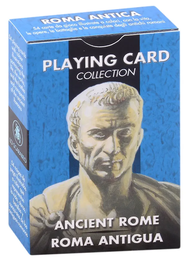 54 игральные карты с цветными иллюстрациями, изображающими жизнь, труды, битвы и завоевания древних римлян.