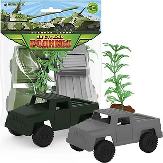 ВОЕННАЯ СЕРИЯ "НА СТРАЖЕ РОДИНЫ" позволит побывать в мире приключений и риска. Погружаясь в игрушечный мир солдатиков можно оказаться в эпицентре военных действий, примерить роль генерала или простого солдата, защитить Родину от вражеского нападения, отразить атаки и захватить в плен противников, стать настоящим героем. Преимущества: живое общение, интерес к истории, тактическое мышление, коммуникативные навыки. Комплектация: машина - 2 шт, дерево - 2 шт