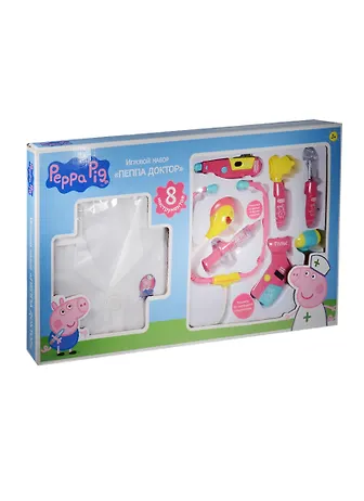 Данный набор состоит из 8 предметов, 5 из которых обладают световыми и звуковыми эффектами. Во время обследования, лечения игрушек или друзей маленький доктор сможет услышать биение сердца, который воспроизводит стетоскоп. На термометре, тонометре, отоскопе и зеркальце есть кнопки, нажав на которые, можно включить световые и звуковые эффекты. В наборе есть докторский халат с изображением персонажа из популярного детского мультика "Свинка Пеппа".