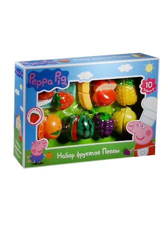 В игровом наборе фруктов «Peppa Pig» 10 предметов: клубника, банан, яблоко, ананас, лимон, апельсин, арбуз, виноград (каждый продукт разделен на 2 половинки, скрепляющиеся липучкой), разделочная доска, безопасный нож. Игрушки выполнены из высококачественного пластика без острых углов. Товар сертифицирован. Упаковка: подарочная коробка с окном 37х25х6 см.