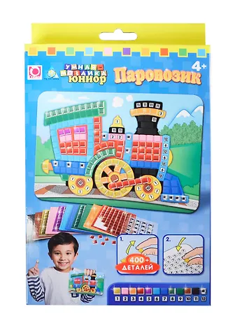 Умная мозаика Юниор Паровозик включает в себя 400 самоклеющихся деталей разноцветных, которые не нужно вырезать, их достаточно приклеить к месту на картинке основе с соответствующей цифрой.