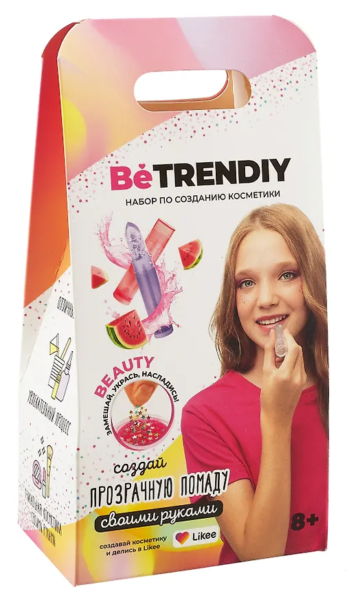 Игрушка для детей старше восьми лет в наборе: Научно-познавательный набор модели косметика DIY Be TrenDIY Beauty "Прозрачная помада". В наборе: тюбики помады (2 шт.), волшебный порошок, мерный стаканчик, шпатель, ароматизатор, украшения, основа, перчатки.
