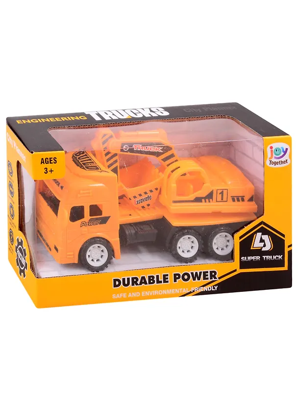 Реалистично выполненная грузовая машина станет достойным пополнением в гараже у ребёнка. В игрушке предусмотрен фрикционный механизм движения (на разгон), позволяющий ей ехать вперёд самостоятельно. Платформа с ковшом поворачивается, ковш поднимается и опускается.