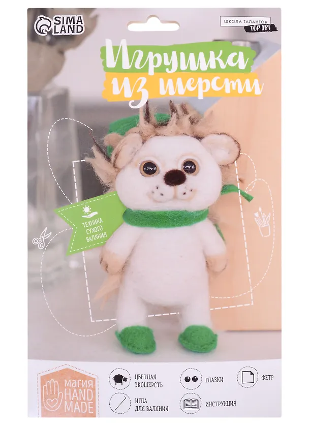 В этом наборе собрано всё самое необходимое для создания своими руками игрушки в технике сухого валяния. Раньше чтобы смастерить что-то подобное приходилось искать шерсть разных цветов в магазине, у бабушки, в маминых коробочках с пряжей, а теперь всё необходимое есть в комплекте для творчества. Теперь каждый, даже начинающий любитель фелтинга, быстро смастерит красивую игрушку.