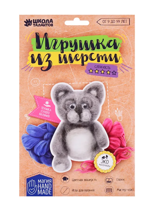В этом наборе собрано всё самое необходимое для создания своими руками игрушки в технике сухого валяния. Раньше чтобы смастерить что-то подобное приходилось искать шерсть разных цветов в магазине, у бабушки, в маминых коробочках с пряжей, а теперь всё необходимое есть в комплекте для творчества. Теперь каждый, даже начинающий любитель фелтинга, быстро смастерит красивую игрушку.
