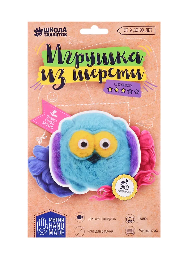 В этом наборе собрано всё самое необходимое для создания своими руками игрушки в технике сухого валяния. Раньше чтобы смастерить что-то подобное приходилось искать шерсть разных цветов в магазине, у бабушки, в маминых коробочках с пряжей, а теперь всё необходимое есть в комплекте для творчества. Теперь каждый, даже начинающий любитель фелтинга, быстро смастерит красивую игрушку.