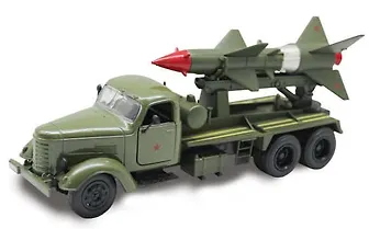 Металлическая машина "Ракетный комплекс" - серьезная заявка на победу! Такая машина должна быть в арсенале любого военачальника, пусть и в пределах игровой комнаты. Модель выполнена в масштабе 1:36 и оснащена инерционным механизмом. У машины открываются двери, при этом зажигается свет фар и включается звук.