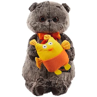 Басик держит в лапках забавную игрушку – жёлтенькую сову, сшитую из флиса. Также на Басике оранжевый галстук бабочка.