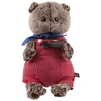 Басик в симпатичном комбинезоне в тетрадную клеточку из х/б ткани цвета сочной малины. Комбинезон сшит на лямочках и с двумя накладными кармашками. В комплекте – шейный хлопковый платочек василькового цвета в мелкий белый горошек. В лапках у кота забавная рыбка из тонкой замши графитового цвета.