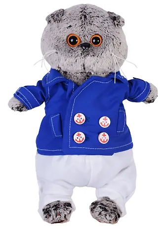 Кот Басик одет в торжественно-парадный костюм, состоящий из ультрамаринового кителя и кипенно-белых брючек. Китель отделан белоснежной строчкой и украшен оригинальными пуговками с алыми якорьками.