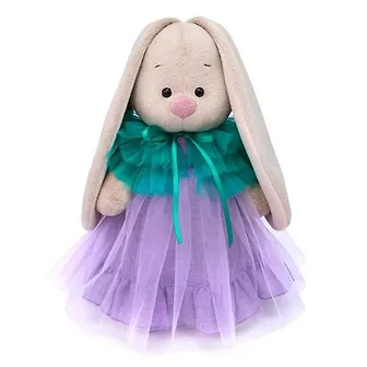 На Зайке необычный наряд — двойное лиловое платье из марлевки и сеточки. Поверх платья объемный воротник-пелерина из нескольких слоев сеточки сочного изумрудного цвета. Пелерина завязывается на атласный бант в тон самой пелерины.