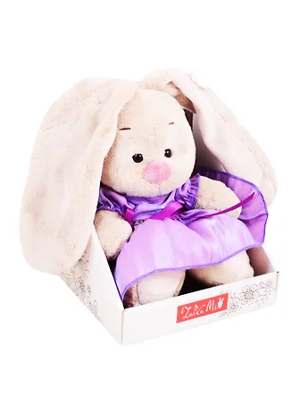 Милая и добрая игрушка. Зайка замечательная, такая мягкая и красивая. На ушке у зайки маленький розовый бантик из шёлковой ленточки, мордочка очаровательная: глазки как две чёрные бусинки, носик бархатный розовый и бровки-домиком. Платье снимается с игрушки, выполнено из гладкой сиреневой ткани с вкраплениями блестящей нитки, из-за этого платье красиво переливается при любом свете: на дневном свету - перелив с синим оттенком, при вечернем свете искусственных ламп - золотистый отлив. Смотрятся эти переливы очень интересно и красиво. Платье простое по крою, но сшито качественно, нитки ниоткуда не торчат, а цвет платья с переливом очень украшает игрушку. Рекомендую эту милую зайку к приобретению, она порадует человека любого возраста.