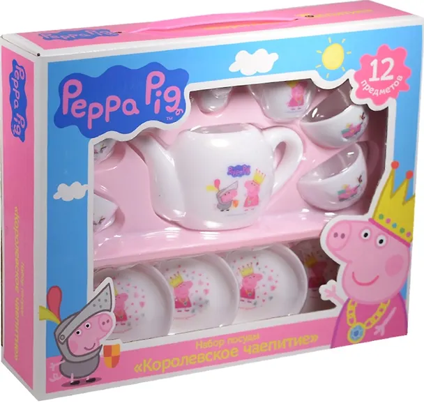 В наборе «Королевское чаепитие» ТМ «Peppa Pig» 12 предметов: 4 чашечки, 4 блюдца, сахарница, молочник, чайник с крышечкой. Чайный сервиз изготовлен из пластика, рассчитан на 4 персоны. Все предметы декорированы ярким принтом: изображением принцессы Пеппы и ее брата Джорджа в рыцарских доспехах. Упаковка – открытая коробка размером 25,5 х 20,5 х 5 см.
