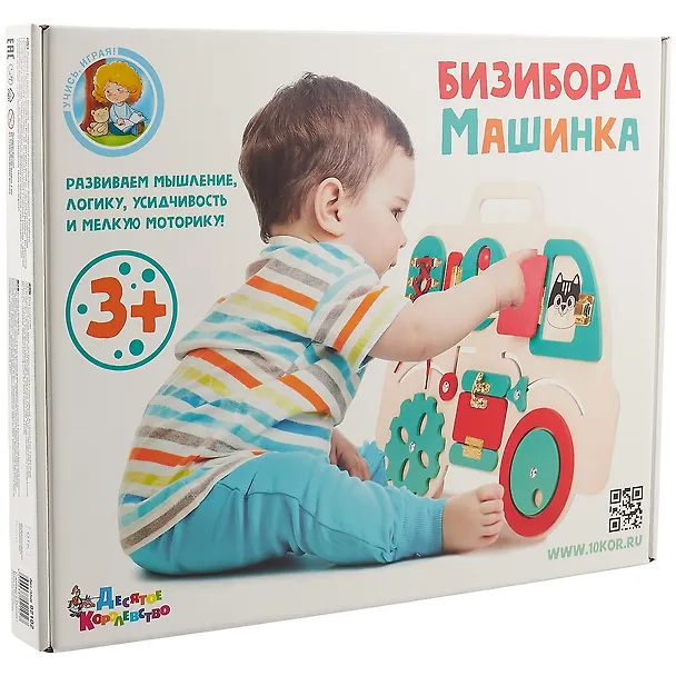 Бизиборд «Машинка» представляют собой стенд из высококачественной неокрашенной фанеры толщиной 7 мм, на котором размещены познавательные элементы: замочек, щеколда, шестеренка, шнуровка и другие предметы. Деревянные элементы окрашены безопасными красителями на водной основе и надежно крепятся к доске.