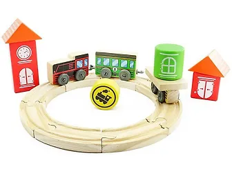 Трасса локомотив - полотно дороги состоит из 6 элементов, которые соединяясь друг с другом, образуют кольцо. По нему будет передвигаться локомотив с 2 вагонами, один из которых пассажирский, другой - товарный. В качестве декораций выступают 2 домика различной высоты. Способствует развитию фантазии, памяти, моторики и сообразительности.
