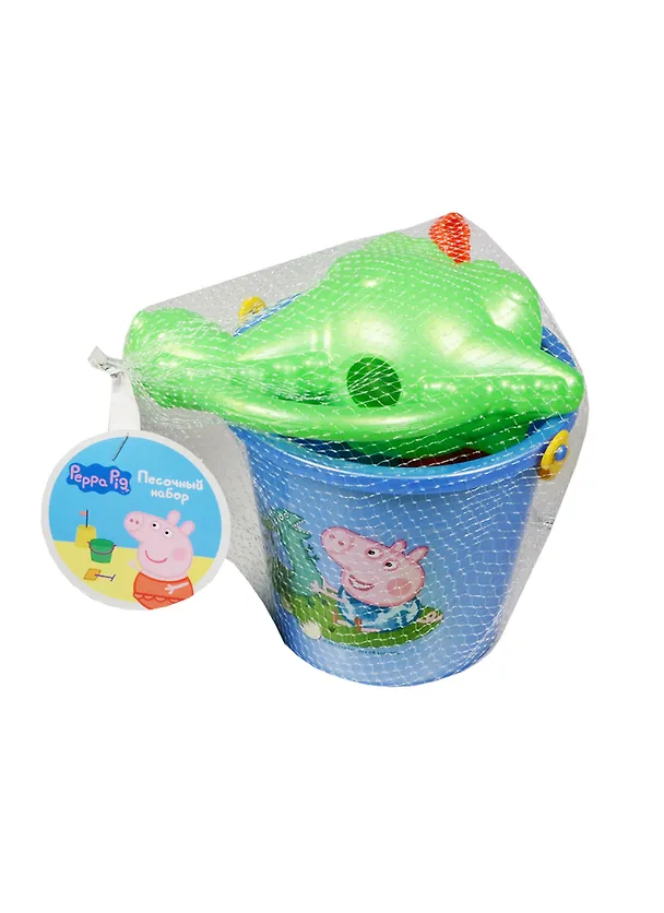 В песочном наборе «Peppa Pig» 5 предметов: ведерко объемом 0,9 л с изображением Пеппы и ее брата Джорджа, лейка в виде динозавра высотой 13,5 см, совочек длиной 16,5 см, 2 формочки (морская звезда, рыбка). Игрушки выполнены из высококачественного безопасного пластика. Товар сертифицирован. Упаковка - сетка с этикеткой.