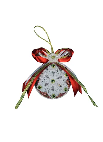 Игрушка новогодняя "Снежинка с бантиком" из бумаг ручного отлива.