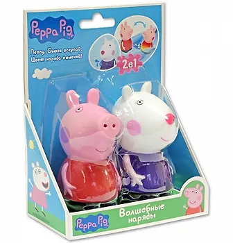 Очаровательная Свинка Пеппа и ее подруга Овечка Сьюзи восхитят малыша, ведь наряды на них не простые, а волшебные! Опустите игрушки в теплую воду, и, как по волшебству, красное платье Пеппы станет жёлтым, а фиолетовое платьице Сьюзи - розовым. Достаньте и