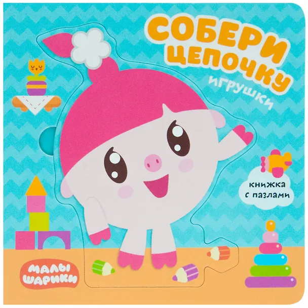 Книжка с пазлами «Игрушки» серии «Собери цепочку» с очаровательной Нюшенькой на обложке обязательно станет любимой! Шесть картинок-пазлов  познакомят малыша с пирамидкой, мячиком и другими игрушками. Их можно вытащить из плотных картонных страничек, собрать в цепочку и придумать свою историю или сказку.