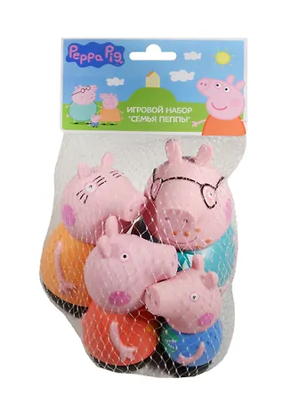 В игровом наборе для ванной "Семья Свинки Пеппы" 4 фигурки: Джордж с леденцом (6,5 см), Пеппа с мороженым (8 см), Мама Свинка с букетом (10 см), Папа Свин с портфелем (11 см). Фигурки брызгаются водой, их головы вращаются. Игрушки выполнены из высококачественного пластизоля, поэтому имеют длительный срок службы. Товар сертифицирован и безопасен при использовании по назначению. Упаковка: сетка с хентегом.