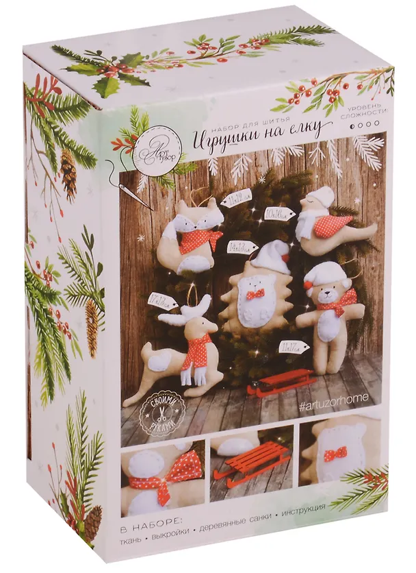 В Новый год нам очень хочется, чтобы в душе и в доме царила особенная атмосфера волшебства. Один из способов создать праздничное настроение – украсить новогоднюю ёлочку игрушками, сделанными своими руками. С помощью нашего набора сшить их вам не составит труда. А процесс создания обязательно подарит радость! Украшения наполнят дом теплом и уютом, станут его изюминкой и предметом гордости. В набор для шитья входит: ткань, выкройки, деревянные санки, инструкция. Дополнительно вам потребуется: ножницы, мел или карандаш, швейные иголки и булавки, нитки, наполнитель, клей-гель. Размеры изделий: 11 х 12 см, 10 х 16 см, 14 х 13 см, 17 х 13 см, 11 х 17 см. Коробка изготовлена из плотного картона, не мнётся при транспортировке. Пусть праздник придёт в ваш дом!