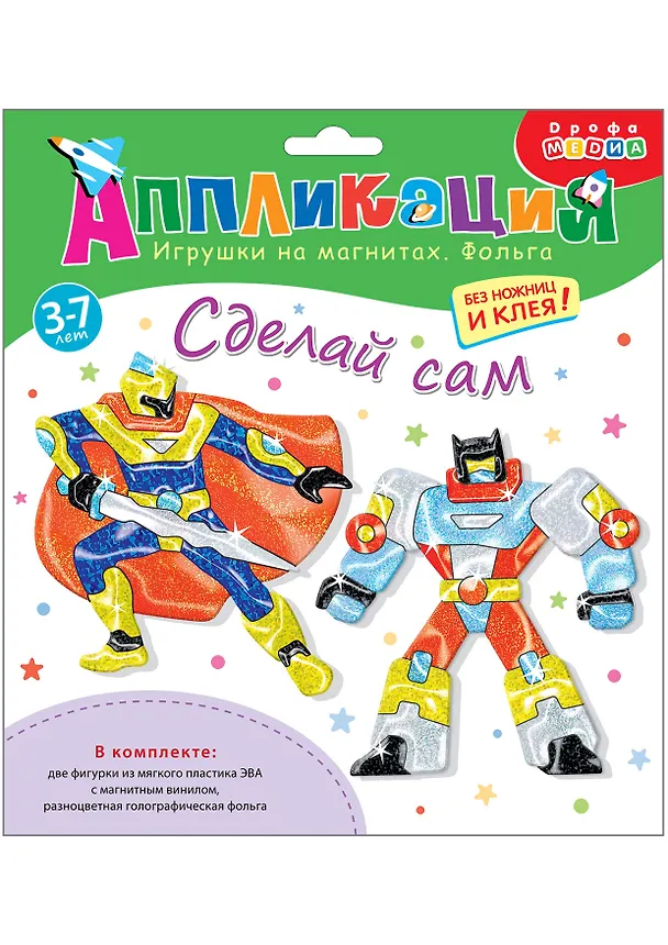 Оригинальная поделка - весёлая игрушка из ЭВА с магнитным винилом, раскрашенная с помощью фольги. Благодаря голографическому эффекту фольги, готовое изделие отличается необыкновенной яркостью и насыщенностью. В наборе 2 поделки. Фигурка получается яркой, красочной и очень эффектной, благодаря переливающейся голографической фольге. Главное, внимательно читайте инструкцию, и у вас всё получится! С обратной стороны фигурки магнитный винил, поэтому её можно легко закрепить на магнитной доске или холодильнике.