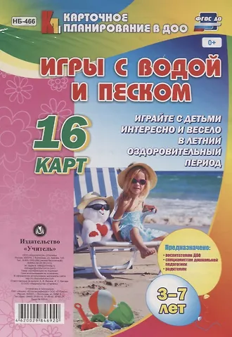 В пособии, созданном в удобной карточной форме, представлены игры-задания для игр с водой и песком, которые дадут возможность детям не только интересно и увлекательно провести время летних прогулок на участке, но и позволят развить конструктивные способности, мелкую моторику, пространственное воображение и фантазию, закрепить знания о форме, цвете предметов, поспособствуют развитию речи и обогащению словарного запаса.