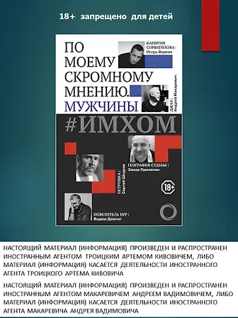 Перед вами альманах мыслей заметных мужчин современности, представителей разных поколений. #ИМХОМ (от англ. In my humble opinion. Man) – скромные мнения мужчин, в том числе Юрия Мамлеева, Вик тора Мережко, Сергея Шнурова, Андрея Макаревича, Игоря Верника, Захара Прилепина, Артемия Троицкого, Ивана Вырыпаева, Вадима Демчога. Эта книга – антология воззрений, собранных в период 2009 – 2018 гг. В ее основе взгляды героев на природу добра и зла, размышления о душе и вере, о любви и предназначении, о Родине и культурной идентичности, о роли человека во Вселенной. Художественные портреты к сборнику выполнены художниками, которые опирались лишь на тексты, не зная, кому они принадлежат.