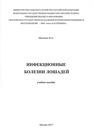 Изложены современные данные по наиболее значимым инфекционным болезням лошадей - сапу, мыту, инфекционной анемии, ринопневмонии, гриппу, африканской чуме, инфекционным энцефаломиелитам и эпизоотическому липфагиниту. Особое внимание уделено этиологии, эпизоотологии, клиническим и патоморфологическим признакам, методам лабораторной диагностики, лечебно-профилактическим и оздоровительным мероприятиям.