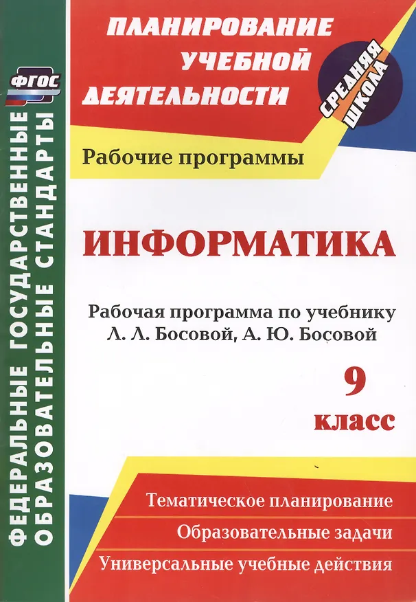 В пособии представлена рабочая программа по информатике для 9 класса, разработанная в соответствии с основными положениями федерального государственного образовательного стандарта основного общего образования, планируемыми результатами, требованиями Примерной основной образовательной программы ОУ и авторской программы Л.Л. Босовой, А.Ю. Босовой, ориентированная для работы по учебнику Л.Л. Босовой, А.Ю. Босовой. Программа содержит развернутое тематическое планирование системы уроков и педагогических средств, с помощью которых формируются универсальные учебные действия; требования к результатам освоения образовательной программы: личностные, метапредметные (регулятивные, познавательные, коммун