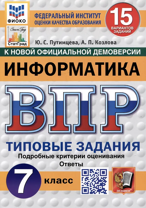 Данное пособие полностью соответствует федеральному государственному образовательному стандарту. Книга содержит 15 вариантов типовых заданий Всероссийской проверочной работы (ВПР) по информатике для учащихся 7-х классов. Сборник предназначен учащимся 7-х классов, учителям и методистам, использующим типовые задания для подготовки к Всероссийской проверочной работе по информатике.