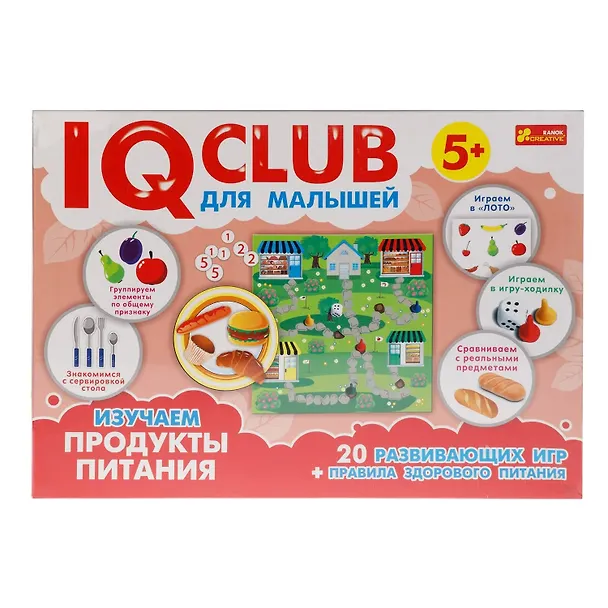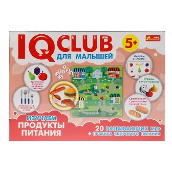 Ранок IQ-club. Для малышей. Изучаем продукты Набор включает: 20 развивающих игр + правила здорового питания, 2 игровых поля + 24 жетоны с продуктами, 4 поля с продуктами питания,Имеют по 6 съемных треугольников-пазлов с изображением продуктов. Знакомим ребенка с правилами и продуктами здорового питания. Изучаем особенности сервировки стола, группирования элементов по общему признаку и сравнения с реальными предметами. Игры имеют разный уровень сложности. Изготовлено из качественного и безопасного картона, покрытого с обеих сторон защитным покрытием, национальный продукт, базируется на передовых методах обучения и воспитания детей от 3 лет, развивает логику и математические способности.