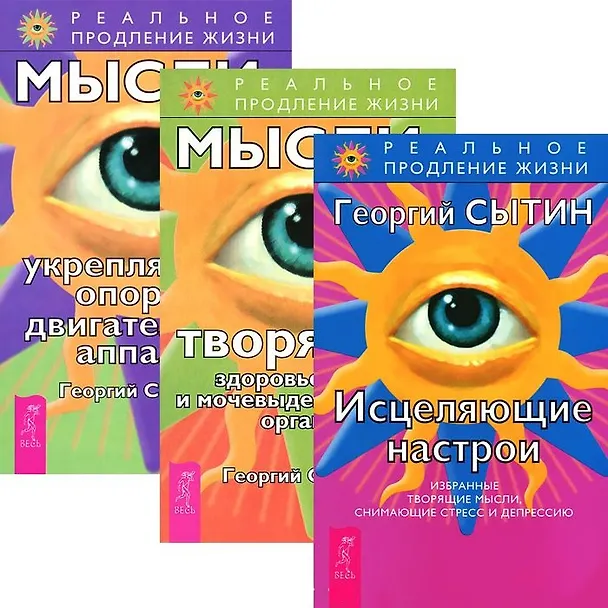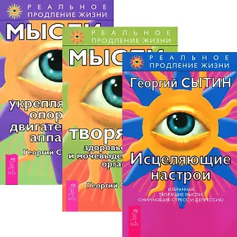 В комплект вошли 3 книги Георгия Сытина серии "Реальное продление жизни": "Исцеляющие настрои", "Мысли, творящие здоровье почек и мочевыделительных органов" и "Мысли, укрепляющие опорно-двигательный аппарат".