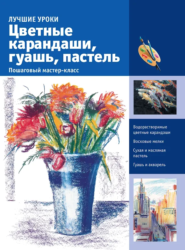 Без цветных карандашей весь мир стал бы черно – белым и безликим. Они совмещают в себе прелесть графики и возможность работы с цветом. Это в большинстве случаев самый первый инструмент, с которым начинающие художники знакомятся еще в детстве. Гуашь, в отличие от акварели, не растекается и ею можно делать четкие рисунки. Она, также как и цветные карандаши, относительно недорога, и прекрасно подходит для освоения азов живописи. Пастель – уникальный материал – она яркая, красивая, приятная на ощупь и к ней совершенно невозможно остаться равнодушным. Она имеет более тысячи оттенков. Она и графична, и очень живописна! В пастели соединяются линия и цвет: ею можно рисовать и писать, работать штриховкой, живописным пятном, сухой или мокрой кистью. Из этой книги вы узнаете обо всех нюансах и тонкостях работы с эти