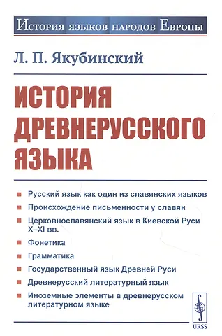 Вниманию читателей предлагается классический труд советского филолога Л. П. Якубинского, посвященный истории древнерусского языка. В обширном введении исследуются происхождение древнерусского языка, вопрос о родстве славянских языков, происхождение письменности у славян, церковнославянский язык в Киевской Руси и его роль в истории русского языка. Далее излагаются фонетика и грамматика древнерусского языка в историческом развитии. Третий большой раздел посвящен древнерусскому литературному языку: в нем рассматриваются государственный язык Древней Руси, в том числе характер языка древнейшего русского правового кодекса — «Русской Правды», исследуются происхождение древнерусского литературного я