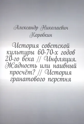 Александр Коробкин — самобытный уральский автор. Предлагаемые уважаемым читателям две научно-популярные статьи рассказывают о некоторых интересных фактах развития культуры СССР периода 60-70-х годов XX века, а также об инфляции как явлении в экономической жизни разных стран и России в частности. Рассказ «История Гранатового Перстня» уводит читателя в мир книг, таинственных талисманов и путешествий. Изображения взяты из открытых источников. Все права на изображения принадлежат их авторам.