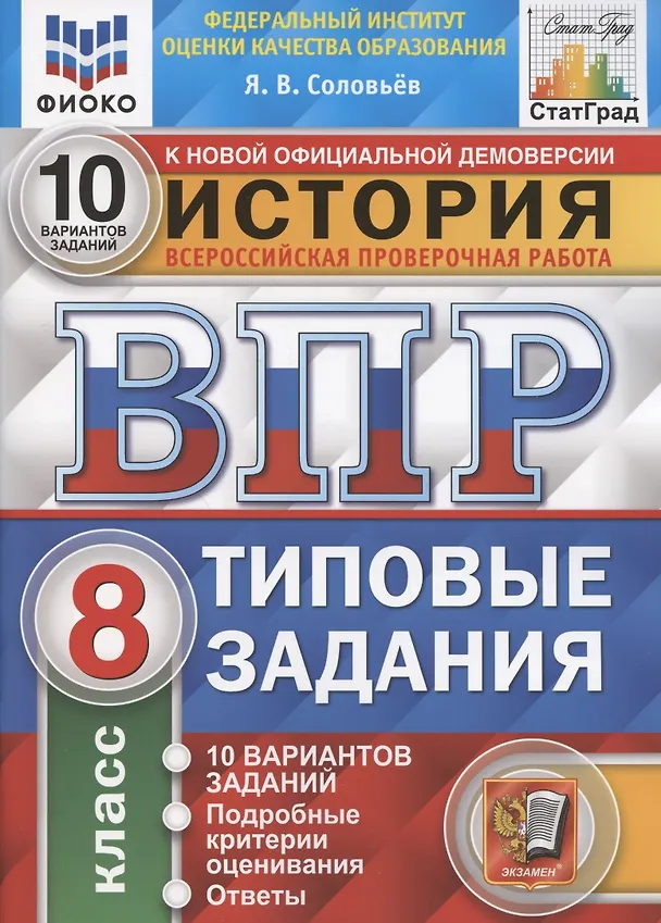 Данное пособие полностью соответствует федеральному государственному образовательному стандарту (второго поколения) и требованиям Историко-культурного стандарта. Книга содержит 10 вариантов типовых заданий Всероссийской проверочной работы (ВПР) по истории для учащихся 8-х классов. Сборник предназначен учащимся 8-х классов, учителям и методистам, использующим типовые задания для подготовки к Всероссийской проверочной работе по истории. Я. В. Соловьёв — кандидат исторических наук, доцент Московского государственного областного университета, автор пособий по истории России, ЕГЭ, ОГЭ и ВПР. Приказом № 699 Министерства образования и науки Российской Федерации учебные пособия издательства «Экзамен