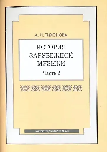 Учебное пособие А. И. Тихоновой "История зарубежной музыки: Учебное пособие", Ч. 2, соответствует содержанию авторского учебного курса того же названия и предназначено для самостоятельной работы студентов Факультета церковного пения в процессе его освоения.