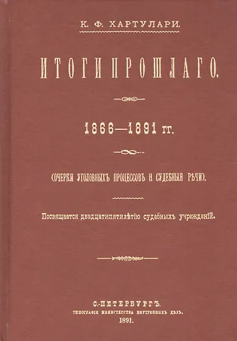 Константин Федорович Хартулари (1841-1908) - известный русский правовед, адвокат, публицист и философ. Служил в Министерстве юстиции, входил в состав Петербургского Совета присяжных поверенных. С 1867 г. был директором Комитета общества попечительства о тюрьмах. Несколько лет был гласным городской Думы, состоял почетным столичным мировым судьей. Хартулари - один из самых ярких отечественных адвокатов. Он участвовал во многих громких делах, вошедших в учебники по адвокатуре. В судебных речах Хартулари наиболее сильными местами являются доказательства и рассмотрение и оценка юридических элементов дела, толкование закона, освещение его примерами из западноевропейских кодексов. Издание книги Хар