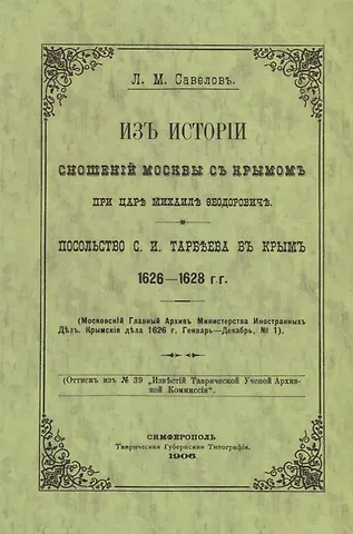 Леонид Михайлович Савелов (1868–1947), русский государственный и общественный деятель, археограф, прозаик, мемуарист, собиратель книг. Его труд «Из истории сношений Москвы с Крымом…», впервые изданный в 1906 г., содержит документы XVII в. – отписки и челобитные в Посольский приказ посланника С.И. Тарабеева и ездивших с ним дворян – Петра Ивановича Савелова, Ивана Басова и др. Книга является ценным источником по истории внешней политики во времена правления царя Михаила Федоровича. Переиздание книги 1906 г.