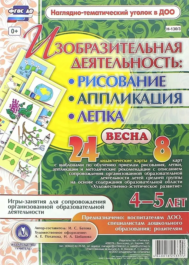 Представлен набор из 24 дидактических карт и 8 карт с шаблонами, позволяющий воспитателю обучить детей 4-5 лет приёмам изобразительной деятельности в рисовании, лепке, аппликации. В методических рекомендациях предложены примерные конспекты игр-занятий художественно-эстетического направления на март - май учебного года, которые помогут воспитателям реализовать требования ФГОС к Примерной общеобразовательной программе дошкольного образования, планировать освоение содержания Программы в соответствии с образовательными областями: "Социально-коммуникативное развитие", "Познавательное развитие", "Речевое развитие", "Художественно-эстетическое развитие", "Физическое развитие".