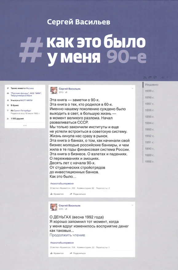 Книга Сергея Васильева, начинавшего свой бизнес с Тверьуниверсалбанка, — уникальные личные заметки о 1990-х. Эта книга о трансформации типичной советской молодежи 1960-х годов рождения в современных бизнесменов 2000-х. Эта книга о том, как менялась страна, ее финансовая система, о становлении капитализма в России, о формировании его основных атрибутов в коллективах, компаниях, банках. Личные взлеты и падения, переживания и эмоции. Бизнес и Власть на примере взаимодействия коммерческих и инвестиционных банков с ЦБ, Минфином, Администрацией Президента. Эта книга о московских банках и их руководителях времен 1990-х.