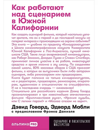 Как работают над сценарием в Южной Калифорнии / Дэвид Говард, Эдвард Мабли; под ред. А. Акопова; [предисл. Фрэнка Даниэля, предисл. А. Акопова]; пер. с англ. — М. : Альпина ПРО, 2024. — 621 с. — (Серия «Сценарное и писательское мастерство»).