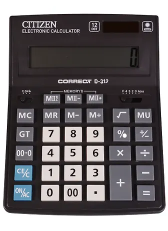 12-ти разрядный настольный калькулятор Citizen CDB1201-BK – незаменимый помощник в офисе, школе и дома. Оптимальный набор функций поможет автоматизировать расчёты: вычисление квадратного корня, коррекция последнего введенного значения, кнопка «00», двойная память, расчёт наценки. Двойное питание (солнечная батарея + батарейка AG10(LR1130)) и автоматическое отключение увеличивают срок службы. Упакован в картонную коробку. Размер калькулятора – 155*205*35 мм, вес – 200 г, цвет – чёрный. Гарантия 3 года. Citizen Business Line - линейка настольных калькуляторов для ежедневного использования в офисе по оптимальной цене. Эргономичная форма, крупные клавиши, устойчивые прорезиненные ножки позволят работать эффективнее. • Разрядность: 12; • Тип питания – двойное (солнечная батарея/батарейка AG10(LR1130)); • Клавиша «00»; • Расчёт налогов; • Двойная память; • Расчёт наценки; • Квадратный корень; • Подходит для ЕГЭ.