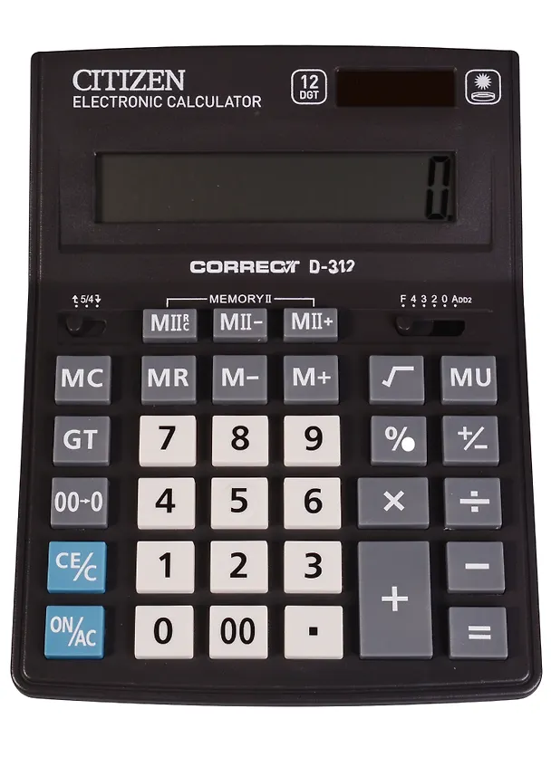12-ти разрядный настольный калькулятор Citizen CDB1201-BK – незаменимый помощник в офисе, школе и дома. Оптимальный набор функций поможет автоматизировать расчёты: вычисление квадратного корня, коррекция последнего введенного значения, кнопка «00», двойная память, расчёт наценки. Двойное питание (солнечная батарея + батарейка AG10(LR1130)) и автоматическое отключение увеличивают срок службы. Упакован в картонную коробку. Размер калькулятора – 155*205*35 мм, вес – 200 г, цвет – чёрный. Гарантия 3 года. Citizen Business Line - линейка настольных калькуляторов для ежедневного использования в офисе по оптимальной цене. Эргономичная форма, крупные клавиши, устойчивые прорезиненные ножки позво