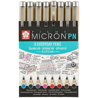 - Чернила в ручках Sakura Pigma Micron PN такие же, как и в классических ручках Pigma Micron: светостойкие архивные чернила на основе пигментов, устойчивые к воде, химическому воздействию, pH нейтральные, быстросохнущие