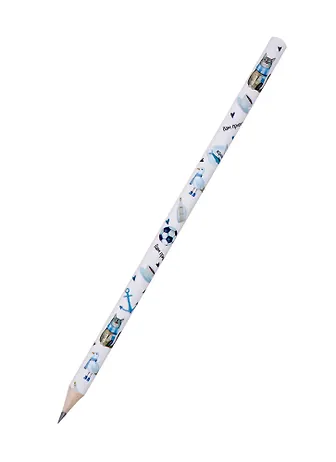 Нормальный карандаш с приятным оформлением, котики и Петербург. Для тех, кто любит и то и другое. Еще изображены корюшка, якорь, чашечка кофе, не очень крупно, в руках держать приятно. Штрих-код внизу и, если что, сточится при затачивании